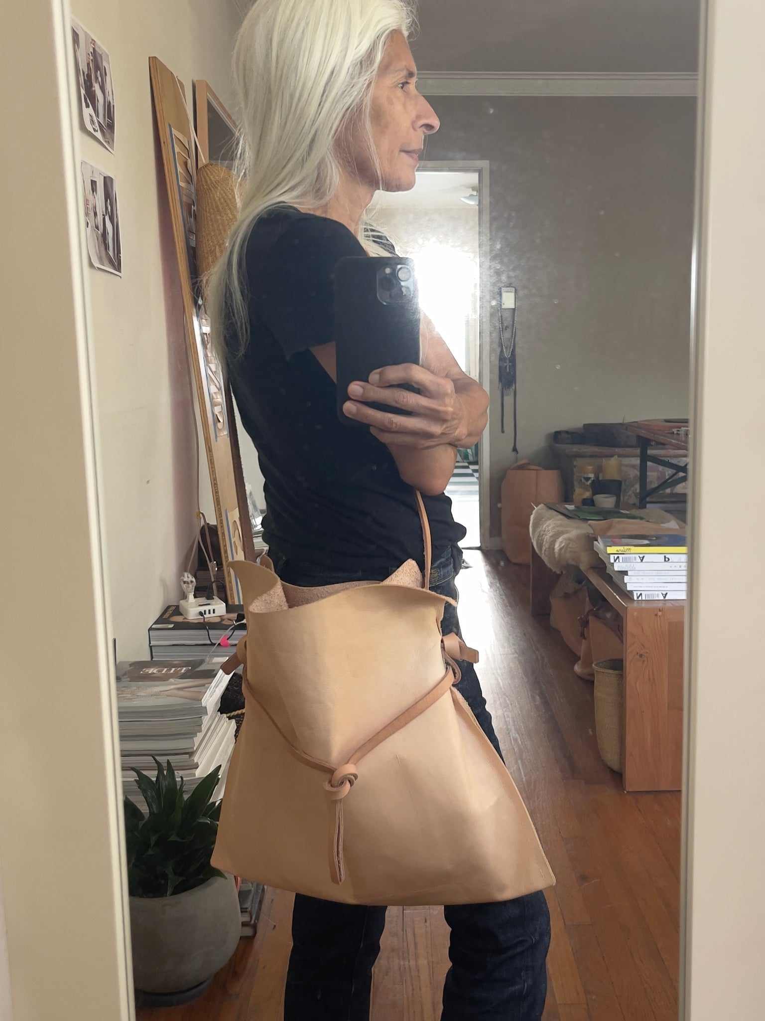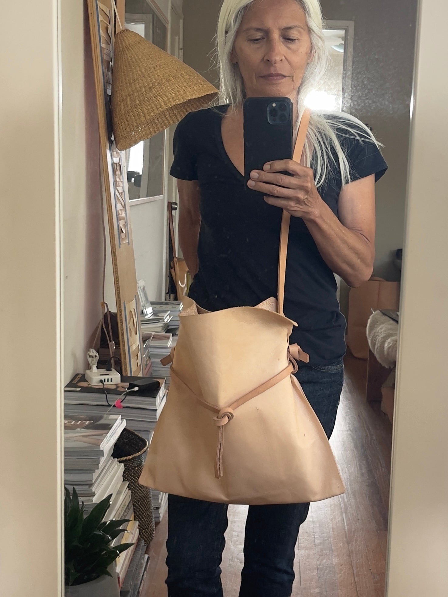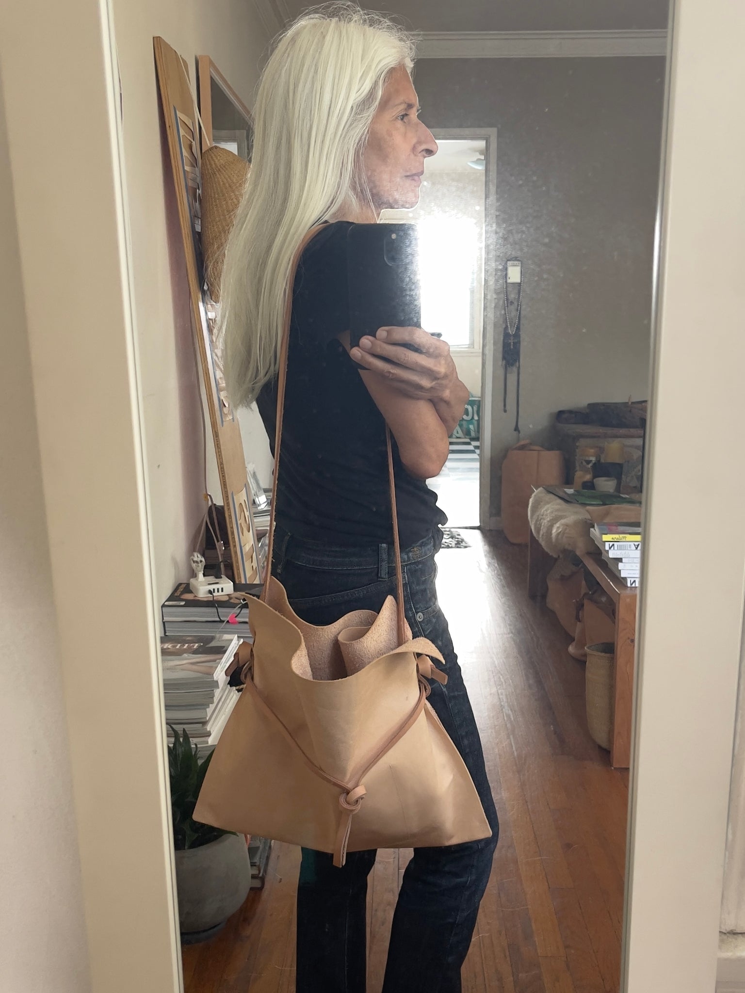 Woman standing wearing a crossbody natural vegetable tanned leather bag (with a light patina). Drawstring style— the veg tan leather ties were removed to wear the bag to its fully extended width. Made with knotted and adjustable straps.