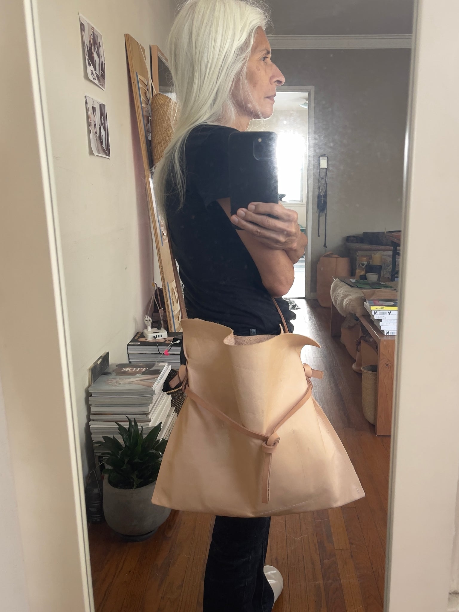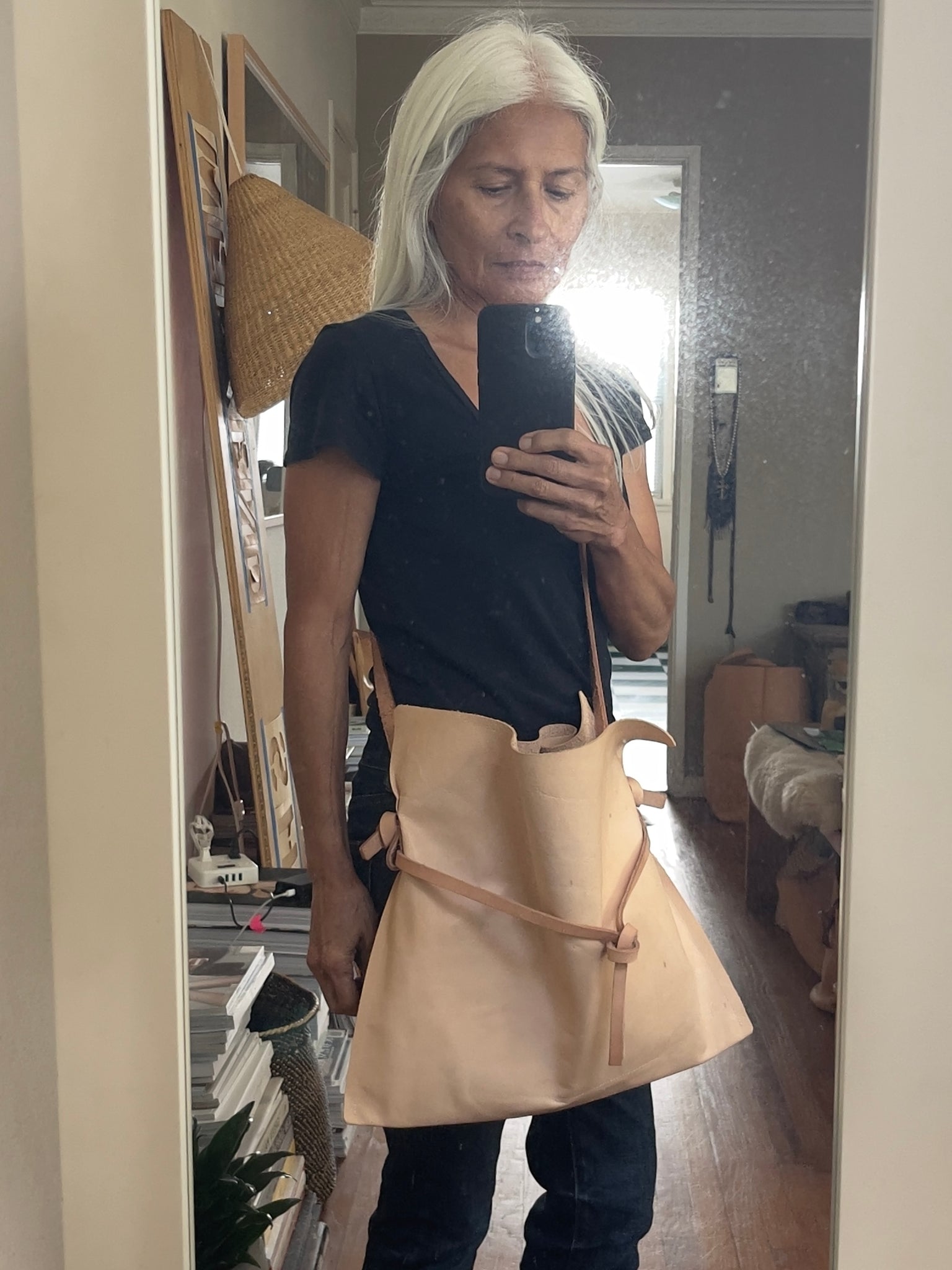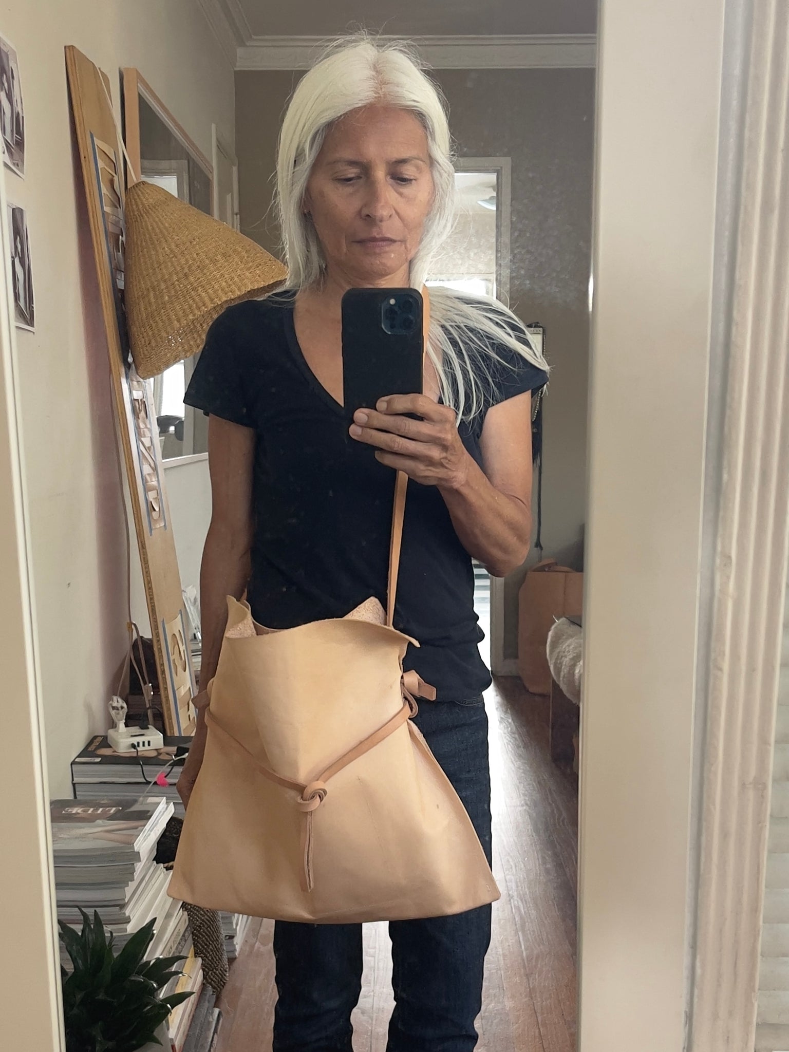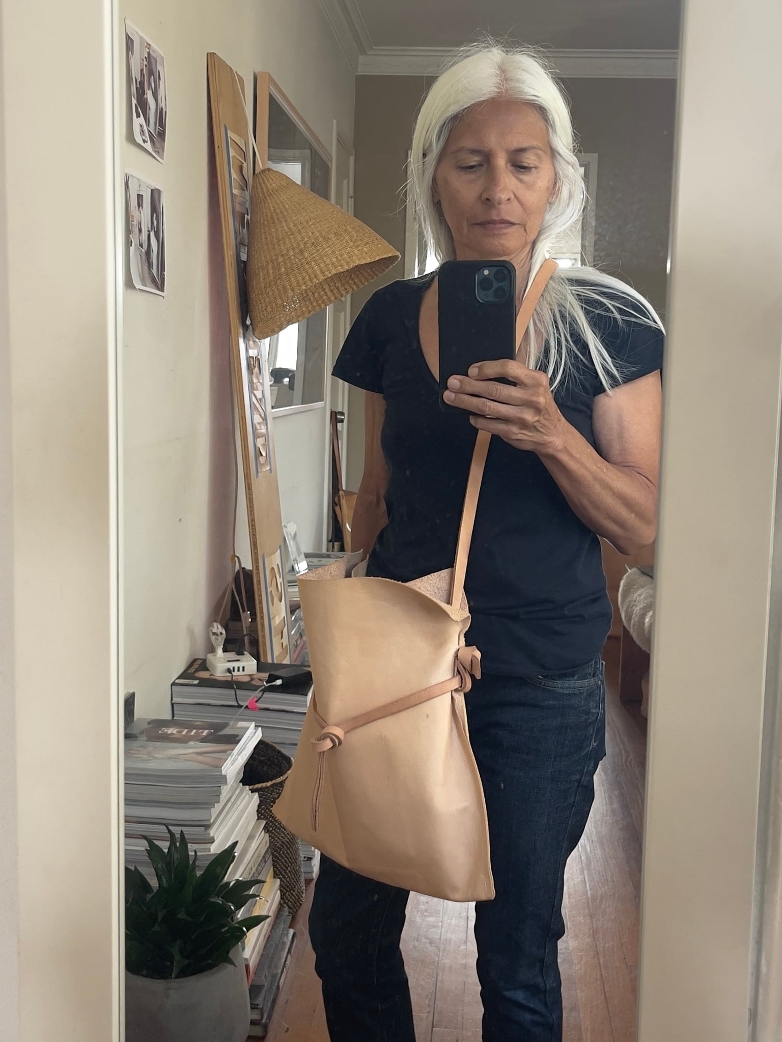 Woman standing wearing a crossbody natural vegetable tanned leather bag (with a light patina). Drawstring style— the veg tan leather ties were removed to wear the bag to its fully extended width. Made with knotted and adjustable straps.