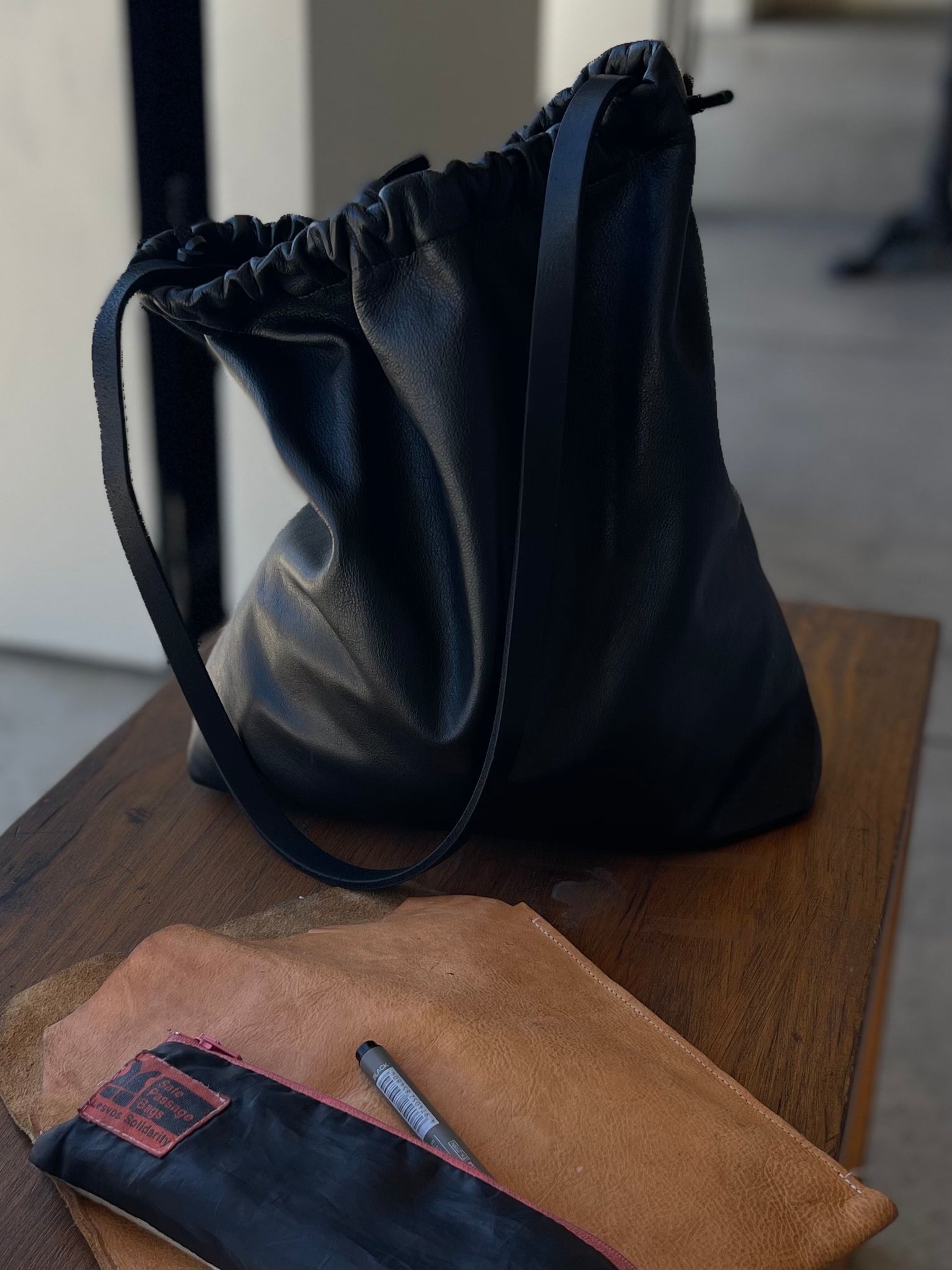 - Hand-Cut Leather Strap + Tie/Drawstring